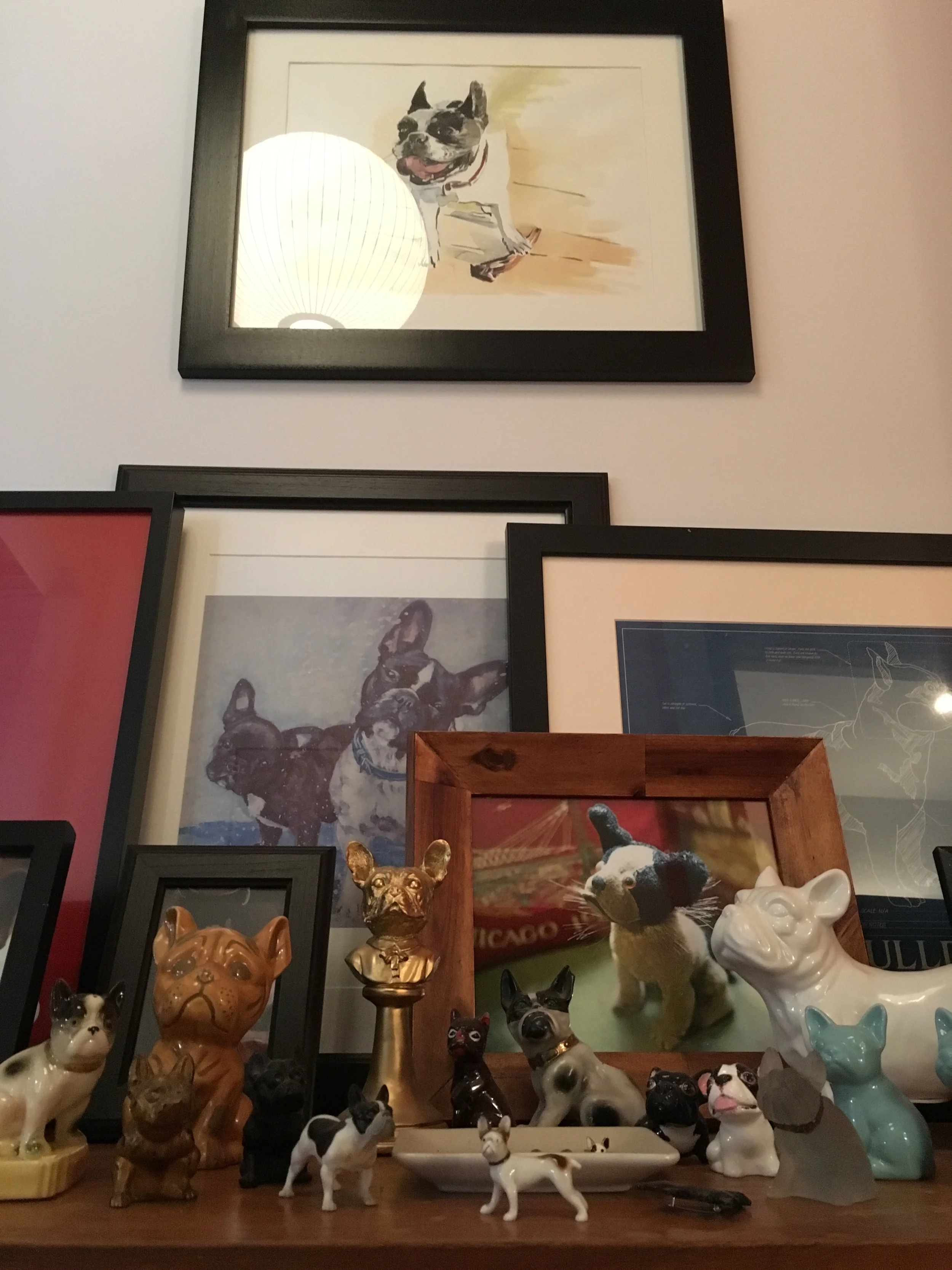 This is the Frenchie Shrine in my house. Most of the artwork and objects are gifts from friends. At the top is a beautiful watercolor portrait of my dear, sweet late Frenchie Prue by Dmitry Samarov. It's not hoarding if it's organized, right?